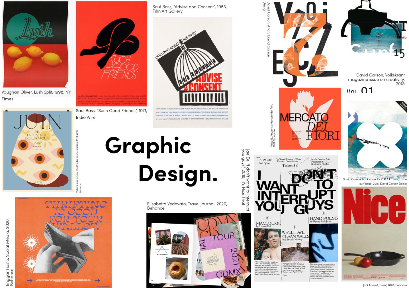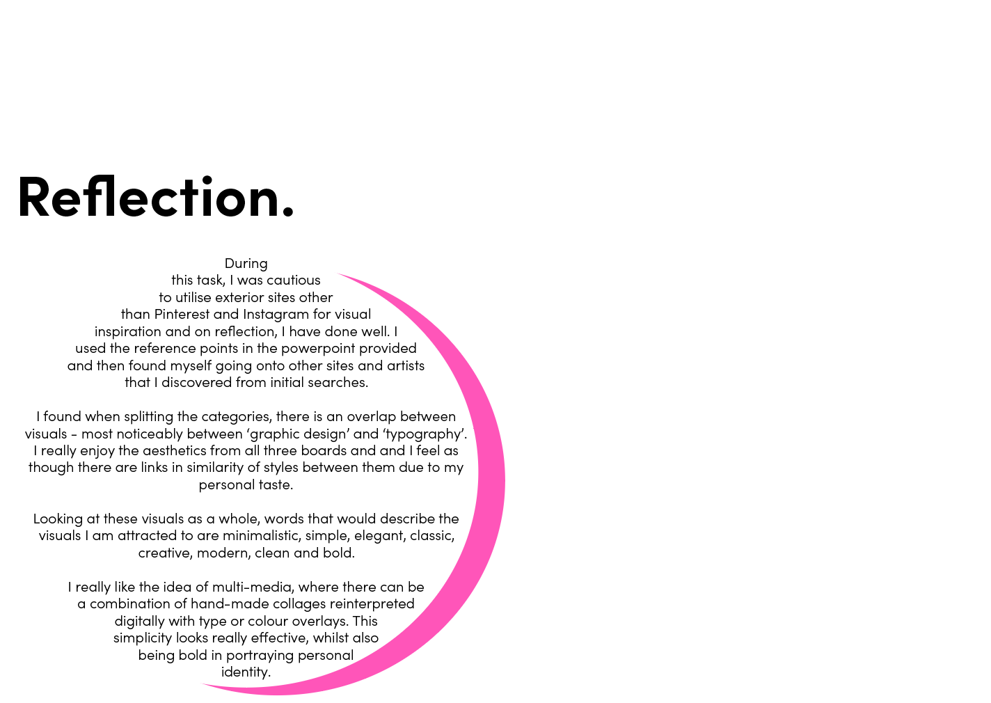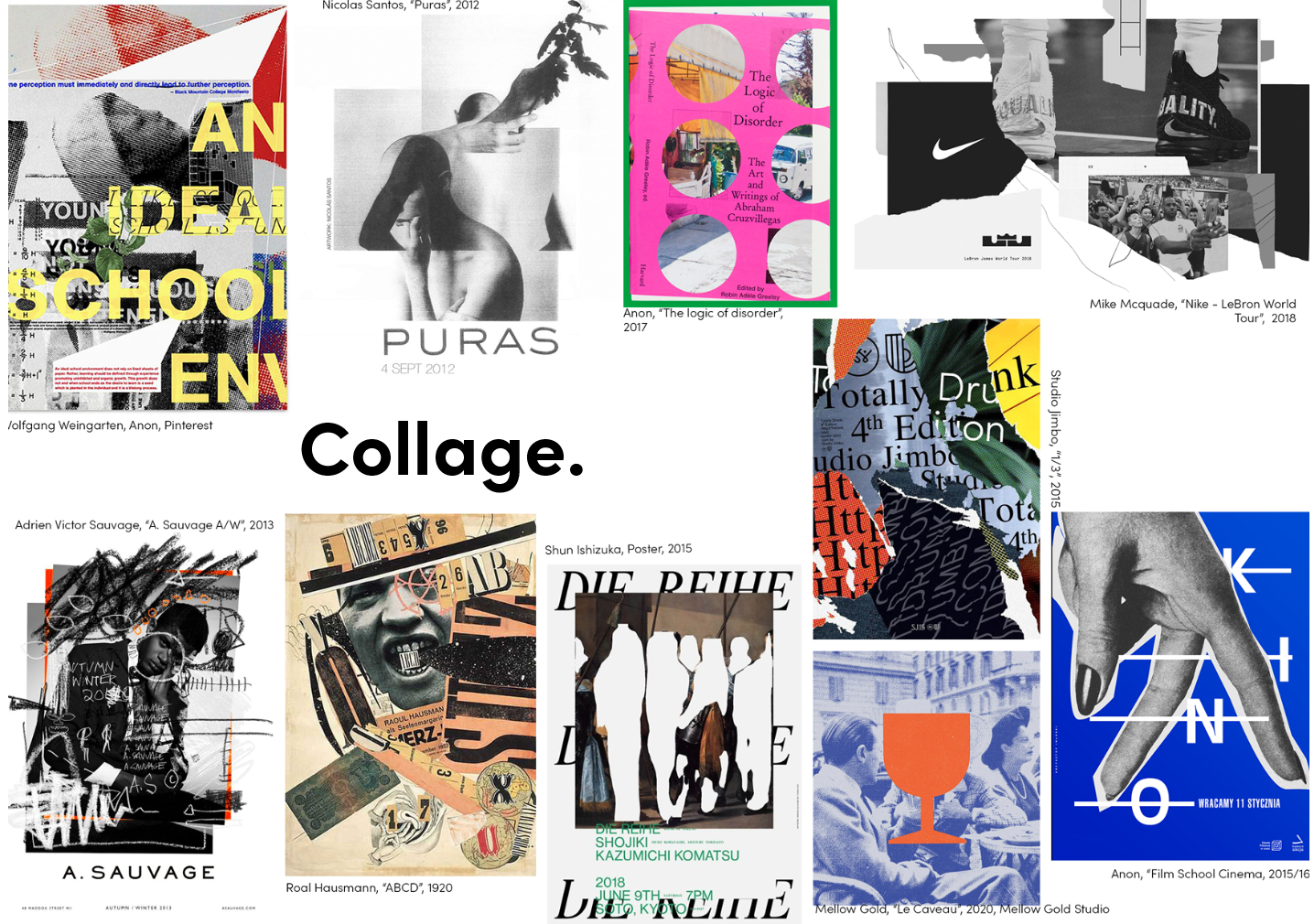 By categorising my visual interests into three themes, ‘Graphic Design’, ‘Typography’ and ‘Collage’ mood boards, I was able to analyse what style of imagery I was subconsciously drawn to. Inspiration was taken from both established and contemporary artists, expanding my knowledge of design work and creating a timeliness to my own visuals, to portray a sense of continuity.