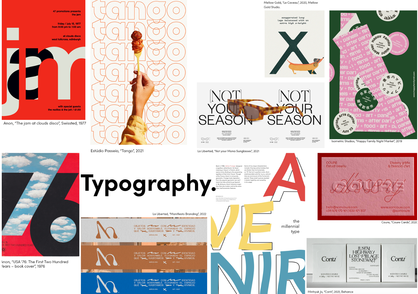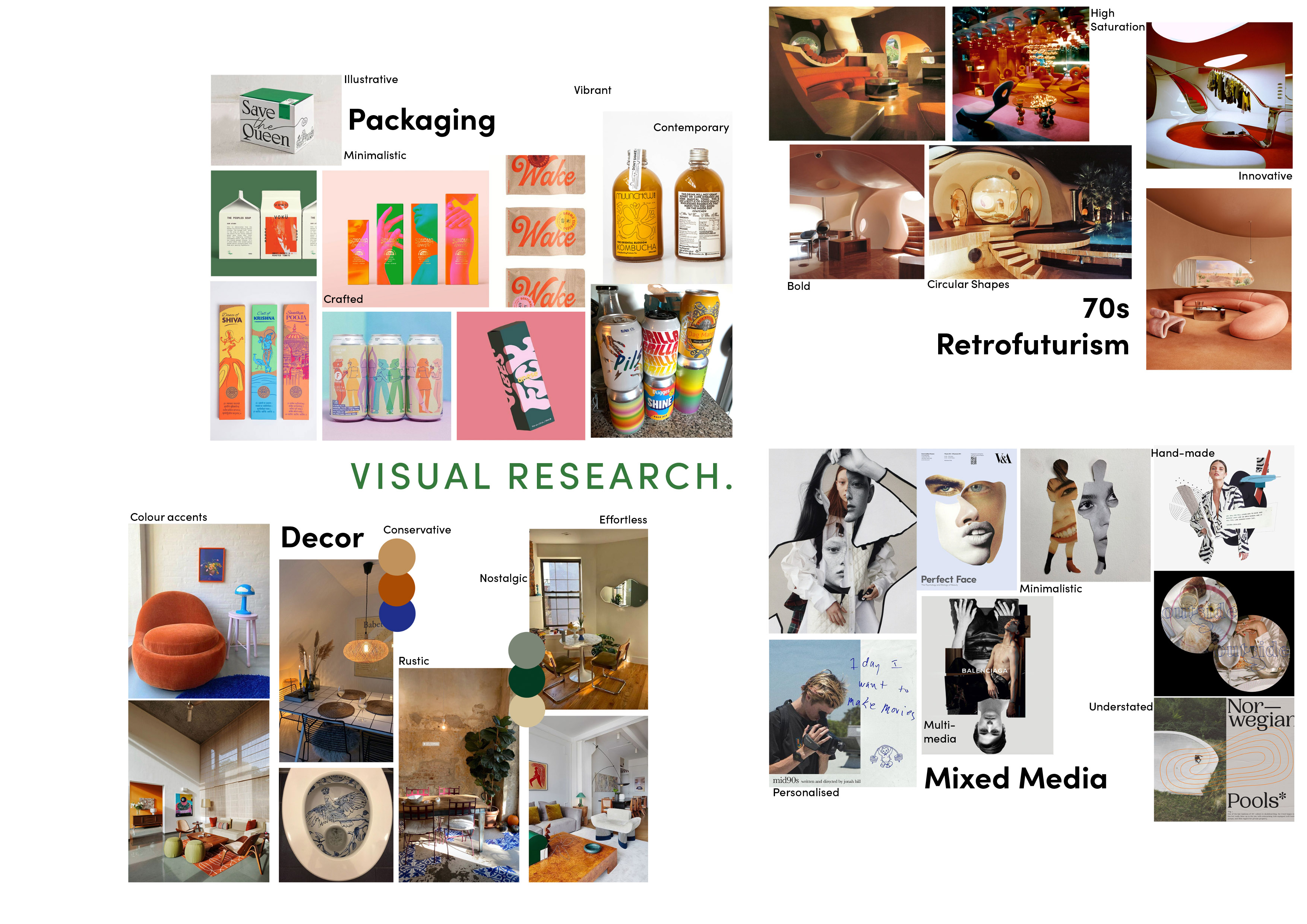 In terms of my personal branding development, through research and concept creation, I have a distinct taste, including: bold type, rustic textures, retro colourways, understated maximalism and the contrast between ‘old and new’.